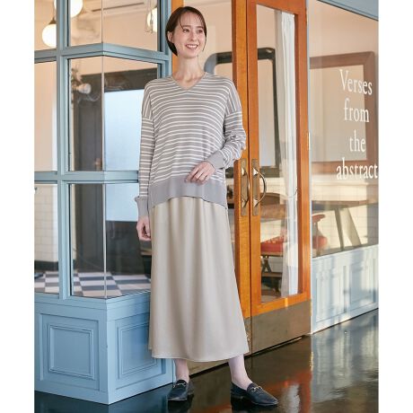 ■デザインサテンの落ち感を生かした、スッキリとしたシルエットのナロースカート。ウエストは総ゴム・内側にドローストリング入りで、きれい目な素材を大人っぽくカジュアルダウンしたリラックス感のあるアイテムです。サテンの美しい落ち感でボリュームが出ずにすとんと落ちるシルエットでありながら、しっかりとした生地の厚みがあるので身体のラインを拾わず、シワになりにくいのもポイント。ニュアンスのある表面感が深みのあるカラーを表現し、大人のリッチ感を感じられるスカートです。※モデル画像はサンプルを使用しております。実際にお届けする商品は、やや光沢感を抑えた素材になります。詳細は物画像をご確認ください。