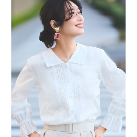 ■デザイン後ろ姿からちらりとのぞくセーラーカラーが大人可愛いブラウス。さり気ない襟の大きさながら存在感抜群で、1枚着としてはもちろんレイヤードアイテムとしても大活躍です。襟の周囲にレースをたたき重たくならないように始末、レイヤードした時に馴染みやすいようにしています。ややリラクシーなシルエットで、繊細なタックとレース使いがアクセント。素材の透け感が大人の甘さに仕上げています。1枚でさらっとサマになり、とことんフェミニンにスタイリングしても、デニムなどとあえてボーイッシュなアイテムとスタイリングしても、どちらのスタイルも素敵です。