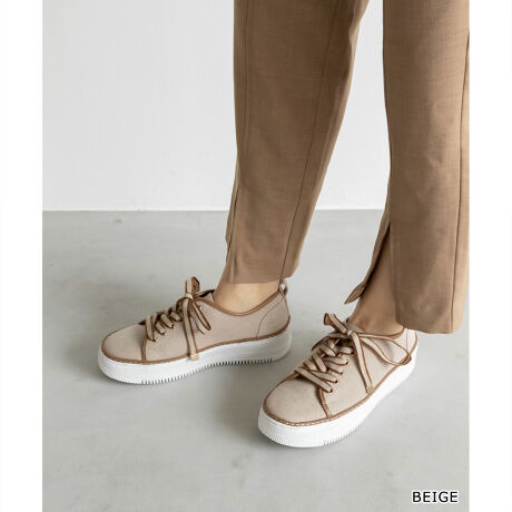 デニムキャンバス素材と配色のリボンで上品にまとめた厚底スニーカー