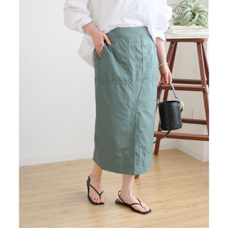 タイトなIラインシルエットが、すっきりとした印象で着用でき、大きなパッチポケットのデザインがあることで腰周りも気になりづらくなっております。