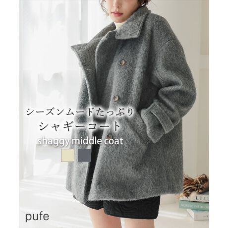 毛足の長いエアリーな素材感が上品なスタンドカラーミドルコート。