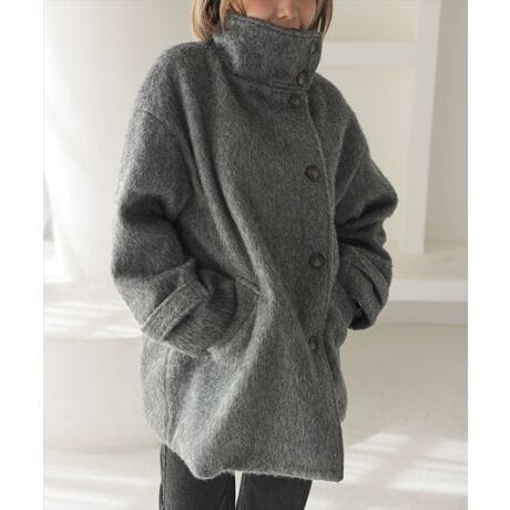 毛足の長いエアリーな素材感が上品なスタンドカラーミドルコート。