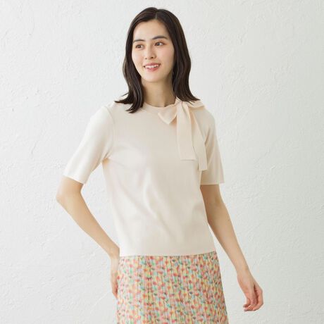 取り外し可能のボウタイがついた2WAY仕様のクルーネックのプルオーバーです。ボウタイをはずして、手持ちのスカーフを通してもかわいいです。プルオーバーは胸ダーツを入れて立体的なパターンで編み立てています。