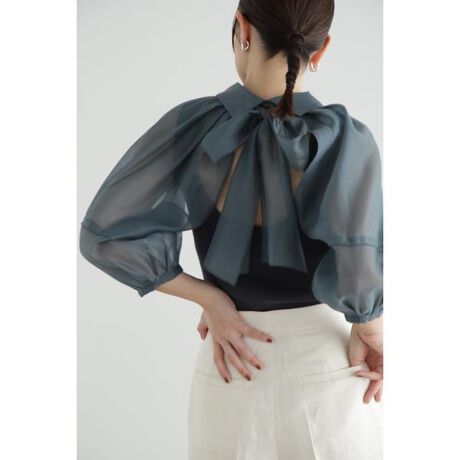 襟付シアーオーガンジーとリブニットのコンビトップス単品使いもできるシアーオーガンジーの袖は取り外しが可能。シャツ襟につけたオーガンジーのリボンは、前後どちらを前にしてもポイントにできます。ニットは背面が深めに開いているデザインで、センシュアルな雰囲気もプラス。シンプルなボトムスと合わせてキレイ目にも、デニムなどに合わせると、カジュアルなデイリーアイテムとしても活躍できます。