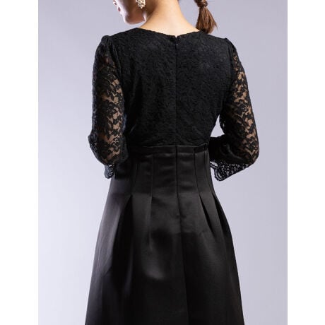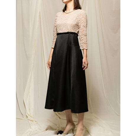 繊細なレースと光沢感のあるスカートで華やかな女性らしさを演出。