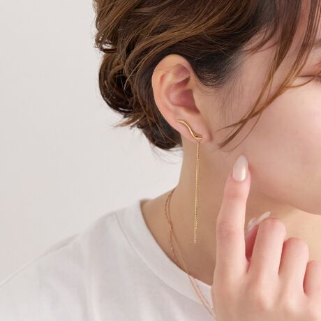 耳たぶに沿うように計算されたメタルラインと、揺れるチェーンが視線を誘うデザインです。