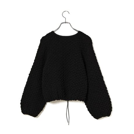 シャーリングを入れた立体感のあるシルエットと、程よいショート丈によるバランスの取りやすさが魅力のカーディガン。モードな雰囲気の漂う凹凸感があり、身体のラインが響きにくいのも嬉しいポイント。裾に紐が通っているので、絞って丸みのあるシルエットでも、絞らずにフラットなシルエットでも着用が可能。ボトムとのバランスや気分によってシルエット変化が楽しめる、着回しの利く一着。