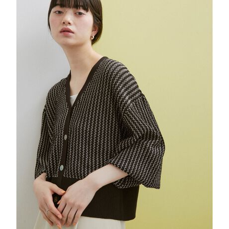 【きらりと光るシェルボタンがアクセント。ボタンを開けても留めても自然と整う、変形ストライプ見えが華やかなコンパクトカーディガン】