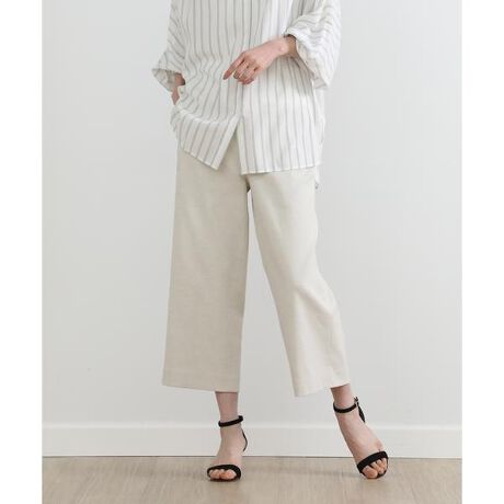程良いゆとりや身長を選ばないクロップド丈、穿き心地の良い後ろウエストのゴム仕様でストレスフリーなパンツです。リラックス感がありつつ、上質感のある素材使いで上品なクリーンさをプラスしました。スタイリングしやすい汎用性の高いデザインもポイントです。素材は凹凸による清涼感と豊かな表情のある綿麻混のポリエステルオックスを使用。白や淡色でも透けにくく、安心して着用していただけます。優れた吸水性と速乾性を持ち、きちんと感と着心地の良さを併せ持っています。・水洗い可・裏地なし・ポケットあり・ウエスト後ろ部分ゴム仕様同素材のジレ品番:7032141009同素材のテーパードパンツ品番:7032161008■サンプル撮影商品■こちらの商品はサンプルでの撮影となっております。実際の商品とは、サイズや色味、素材、デザイン等の仕様が若干変更になる場合がございます。