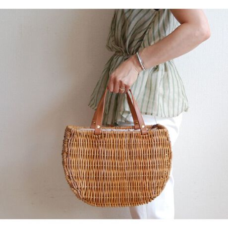 シンプルな半月型のカゴバッグです。ハンドルに使用した牛革がデザインのアクセントになっています。・内ポケ・・・1つ[型番:C7422]