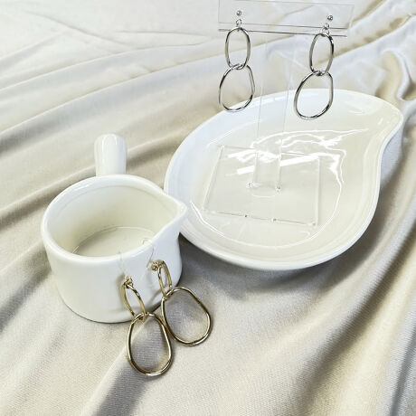 [型番:pjn279]ニュアンスのあるメタルフープを、2つ連ねたモダンなノンホールイヤリングです。ほどよく抜け感の出るアイテムは、デイリーコーデに気軽に取り入れられます。