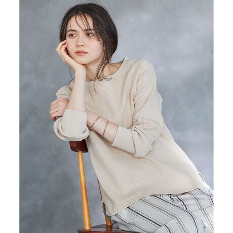 しっかりの目の立ったワッフルのジャージー素材。体のラインをひろわない程よい厚みと毛羽の少ない表面感でシルエットがしっかりの出るので型崩れしにくく、長い季節愛用できます。
