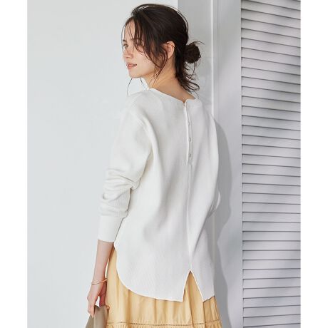 程よいゆとりと、ヒップラインをさり気なくカバーする丈が特徴のプルオーバーです。肩はドロップショルダーでリラックス感をプラス。センターバックのボタンあきやスリットが今年らしいポイントです。襟はラウンドボートに開いているので、素材が持つスポーティーさを大人っぽく着こなせます。コットンローンのギャザースカートに合わせても、後ろスリットのシルエットを崩さずこなれたスタイリングで楽しめます。