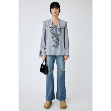 【STRIPE RAFFLE BLOUSE】存在感のあるラッフルデザインがポイントのブラウスです。フロントはくるみボタンになっている為、開けて着て頂く事もオススメです。華奢なストライプ柄がスタイリングを華やかに見せてくれます。※こちらの商品は、素材特性上シワが生じやすくなっております。予めご了承ください。