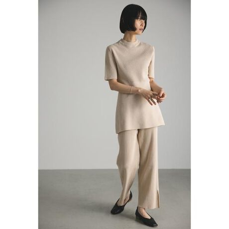 モデル身長168cm(FREEサイズ着用)ウエスト切替のややAラインシルエットが女性らしいニットトップ。ウエストからヒップまわりをさりげなくカバーしてくれます。上部分は縦目ですっきり、下部分は横目でラインをしっかりとでるよう編地の方向を変えたデザインがポイント。リブではなく、しっかりとした目立てのリップル編みで上品見えする一枚です。500GST71-0600(ボタンスリットニットパンツ)とセットアップ着用可能。透け感なし、ストレッチあり。【お手入れ方法】手洗い可
