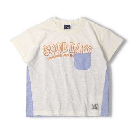 Tシャツ素材と布帛素材と切替デザイン。胸のロゴは少し立体感のあるフロッキープリントになっているのがポイント!(ベビーサイズのみ肩ボタン仕様になります。)【アイテム】トップス カジュアル お洒落 オシャレ かっこいい かわいい 可愛い 普段着 デイリーウェア お出かけ着 お外着 お外遊び着 子ども服 こども服 男児 男の子 ボーイズ キッズ ベビーサイズ トドラーサイズ 幼稚園 保育園 小学校 通園 通学 小学生 2023年夏物新作 丸高衣料 半袖 オフホワイト 白色 ライトグリーン 黄緑色