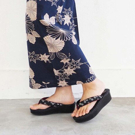 鼻緒の柄と裏地のビビッドカラーがアクセントになり、