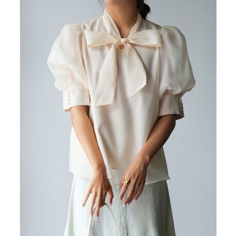 大きなリボンとパフ袖がキュート。2通りの着こなしを楽しめる華やかシアーブラウス。