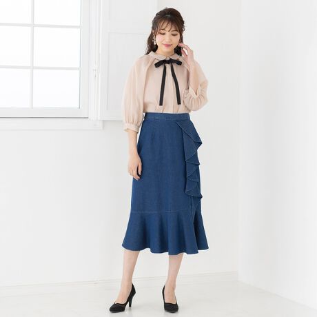 エアリーな透け感と立体的な袖のフォルムがフェミニンな襟付きのリボンブラウス。