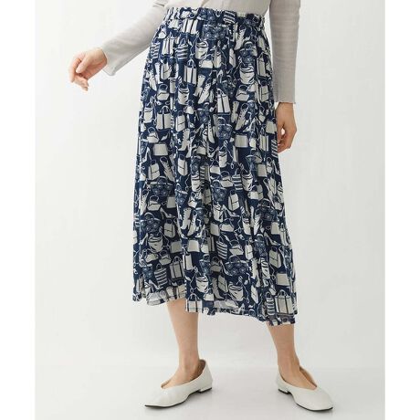 ベーシックなギャザースカートデザインにプリントをのせました。ウエストゴムの履きこみタイプ。足元がすらりと見える程よいひざ下丈に仕上げました。プリントモチーフは、花やペーズリーといった定番柄ではなく、ショルダーやスクラッチ、トートや雑材のバッグをはじめ、パンプス、ハイヒール、ブーツといった靴まで、大人がキュンとするような様々なモチーフを総柄にして表現しました。