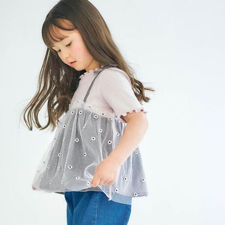 テレコ素材のトップスに、チュールと先染めギンガムチェック柄の布帛生地をドッキングしたトップス。お花の刺繍が入ったチュールに、下の布帛素材が透けるのがとってもかわいいです♪
