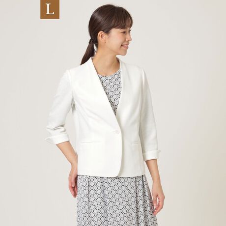 女性らしさがあり自然な上品さが漂うVネックのノーカラー美ジャケットです。
