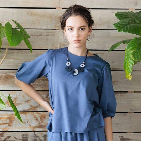 シンプルな無地カットソーも少し袖にタックを入れて女性らしい雰囲気に仕立てました。かわいらしく着られるTシャツ。