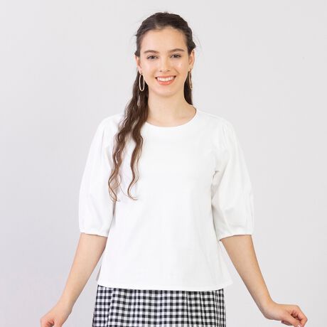 シンプルな無地カットソーも少し袖にタックを入れて女性らしい雰囲気に仕立てました。かわいらしく着られるTシャツ。