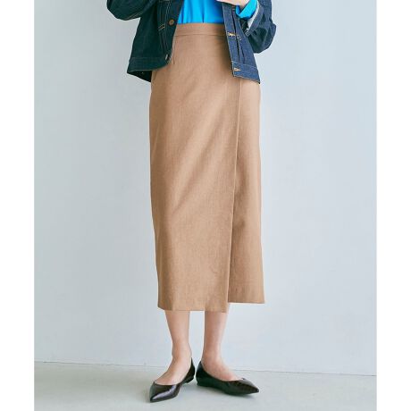 ■デザインロング丈のタイトシルエットスカート。ラップ風にすることでシンプルになりすぎず、キレイ見えながら足さばきの良さも兼ね備えた動きのあるデザインです。ヒップ周りから膝にかけてストンと落ちるシルエットで着やせ効果も期待できます。ウエストはゴム内蔵のスマートバック仕様なのも嬉しいポイント。単品使いはもちろん、同シリーズのジャケットとのセットアップ合わせもおすすめです。