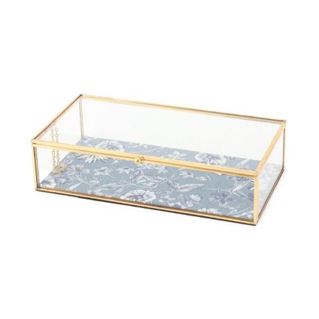 上品な「サマーヒル」の柄をケース内底面に敷き詰めた、クリアガラスとゴールドの組みあわせが上品な蓋つきのジュエリーボックス。