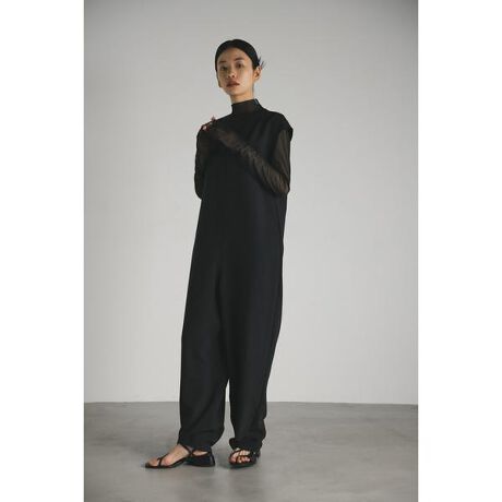 BLK:モデル身長162cm(Mサイズ着用)IVO:モデル身長168cm(Mサイズ着用)袖口のカーブデザインやダーツ使いに拘ったシンプルながらモードなオールインワン。一枚でもハイネックニットのレイヤードでもインナー次第でロングシーズン着用できる一枚です。バックファスナー仕様。透け感なし、ストレッチなし。【お手入れ方法】手洗い可