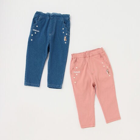 うさぎとお花の刺しゅうが可愛いワンポイントになったロング丈のテーパードパンツです。前のポケット口をスカラップにしたさりげない工夫がキュート。後ろポケットにはプリントネーム入りです。裾裏にドットプリントをほどこしているので、ロールアップしてもおしゃれ。デニムのベルト裏生地裏使いで色落ちにも配慮しました。【おすすめの着用時期は春夏シーズン】【透け感】透けない【生地の厚さ】普通【伸縮性】あり【裏地】なし【ポケット】あり【アジャスター】あり