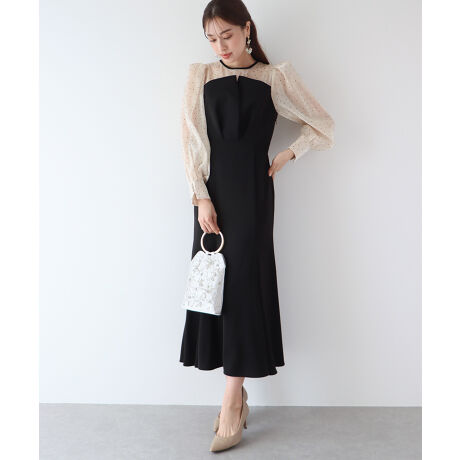 目を惹くドット柄とマーメイドシルエットのワンピースをドッキングしたロング丈パーティードレス。