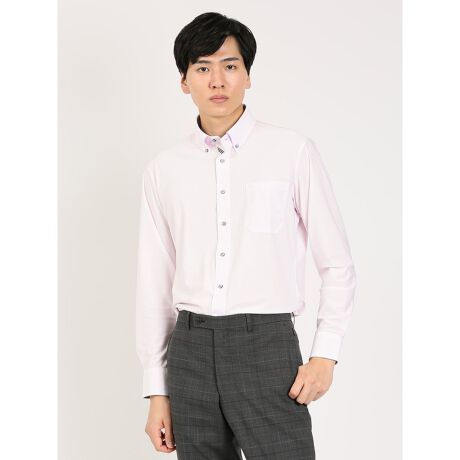 ピンクの無地柄で清潔感があります。衿腰内、カフス裏の別生地切り替え、ヨーク内側・下前立のデザインテープがアクセントになっています。衿型はアンタイド(ノーネクタイ)でも衿立ちよく収まり、オフィスカジュアルにもぴったりなボタンダウンを採用しています。