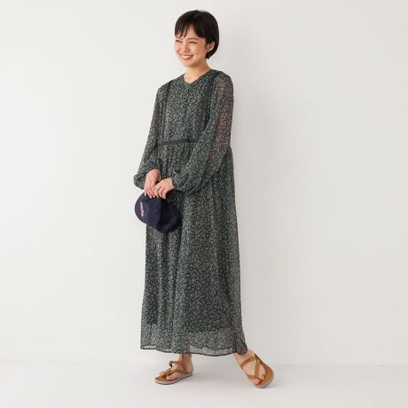 ほんのりとラメの入った透け感のある、小花プリントの生地を使用したワンピース。