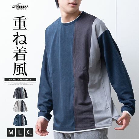 tシャツ メンズ 長袖 トップス 長袖シャツ 秋冬 フェイクレイヤード 重ね着風 Tシャツ