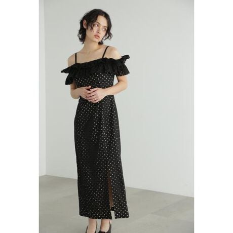 ヴィンテージドレスから着想を得たコットンエンブロイダリーワンピースキャミ型ワンピースに大胆なシャーリングとフリルをあしたったデザイン。胸元から袖にかけてフリルをあわせ、着用すると二の腕に位置する袖のフリルディテールも際立ちます。甘さをおさえた細身のペンシルラインが女性らしさを引き出し、裾にはスリットをいれ、歩くと少し足元が見えるのもポイント。カジュアル感もありながら、一枚で華やぐアイテムとなります。※肩紐の長さ調節可能。表裏でコットンを使用、クロは裏地のインナーカラーにベージュをあわせて配色のきかせています。ポピーは同色仕上げです。