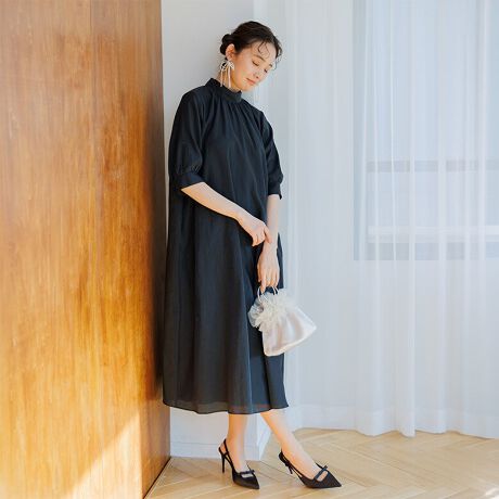 光の当たり方によって見え方が変わるシャンブレー生地を使用した、上品で光沢感のあるドレス。
