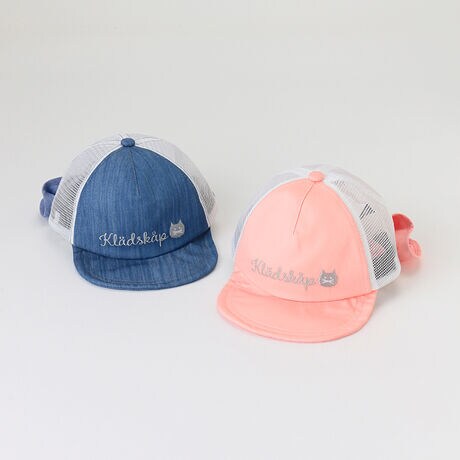 大きなリボンがついているような後ろアングルが可愛いメッシュキャップです。ねこ刺しゅうを添えた垂れ布は、ボタンで簡単に固定できる仕様。内側のスベリが接触冷感生地なので、汗をかいてもさらっと感が続きます。後ろゴムのため、被るだけで頭にやさしくフィット。あごゴムつきです。