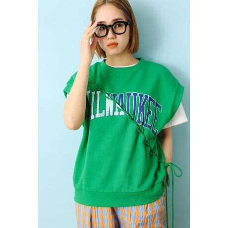 スウェットベストをリメイクして、レースアップでつなぎ合わせたようなデザインがポイント。1枚でも着用でき、ロンTをレイヤードする等、気温によって様々なスタイリングを楽しめるアイテムです。