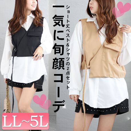 【大きいサイズ】 ショート丈ベスト&シャツ2点セット 大きいサイズ レディース トップス シャツ 春