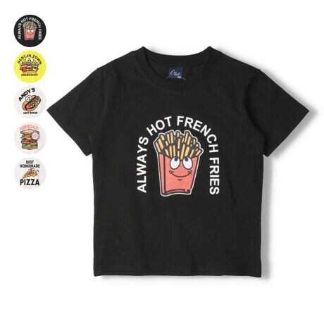 デイリー使いにオススメ!男の子も女の子もユニセックスで着られるジャンクフードモチーフのプリントTシャツ。ポテト、ハンバーガー、ホットドック、サンドイッチ、ピザのアメカジテイストのポップなプリントが可愛い!(ベビーサイズのみ肩ボタン仕様になります。)【アイテム】トップス カジュアル お洒落 オシャレ かっこいい かわいい 可愛い 普段着 デイリーウェア お出かけ着 お外着 お外遊び着 子ども服 こども服 男児 男の子 ボーイズ キッズ ベビーサイズ トドラーサイズ 幼稚園 保育園 小学校 通園 通学 小学生 2023年夏物新作 丸高衣料 半袖 ガールズ 女児 女の子 ホットドッグ サンドウィッチ ジャンクフード ブラック 黒色 イエロー 黄色 クレセント