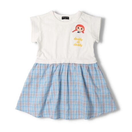 ダディオダディの人気の女の子のキャラクターのダディコちゃん。ポケットからちょっとのぞいたダディコちゃんのプリントが可愛いTシャツに布帛素材のチェック柄のスカート。異素材切替デザインのワンピース。1枚でコーディネートが決まるアイテム。お出かけにもオススメな1枚。(ベビーサイズのみ肩ボタン仕様になります。)【アイテム】半袖 トップス シンプル ガーリー フェミニン カジュアル お洒落 オシャレ かわいい 可愛い 普段着 デイリーウェア お出かけ着 お外着 お外遊び着 子ども こども 女児 女の子 ガールズ キッズ ベビーサイズ トドラーサイズ 幼稚園 保育園 小学校 通園 通学 小学生 2023年夏物新作 丸高衣料 ホワイト 白色 ブルー 青色 グレー 灰色 ピンク コットン100% 綿100%