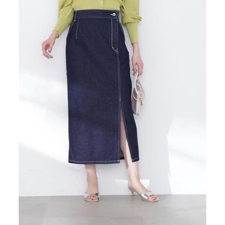 深めにサイドスリットを入れたデニムスカート。Iラインのシルエットを演出し、サイドに寄せたウエストベルトとスリットデザインで、足さばき良好。Tシャツや短丈トップスなどでコンパクトにまとめると、アシンメトリーなベルトディテールが引き立ちます。クリーンな印象のオフホワイト、配色ステッチを効かせたワンウォッシュの2色展開です。