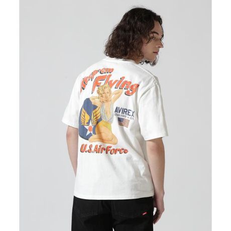 AVIREXでも人気を博すピンナップガールのグラフィックをバック全面的にプリントしたTシャツ。