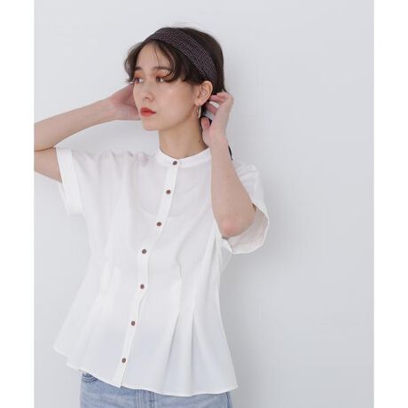 ウエスト周りにタックを入れてシェイプさせた半袖ブラウス。これからの季節に馴じみのいい麻調素材を使用しています。適度にウエストシェイプしたデザインは、配色のきいたボタンがアクセントになり、裾をアウトしたままスッキリ着用できます。二の腕をカバーする袖丈は、袖口の折り返しで、腕をほっそり見せてくれます。キレイめパンツやIラインスカートと合わせてオフィスシーンに、デニムパンツを合わせると大人のオフカジュアルにも着まわしできます。【Designer's Voice】ウエストがスッキリスタイルアップして見えるタックディティール入り。シルエットがほんのりペプラムシルエットになります。ボタンは全開可能なデザインです!※裏地なし