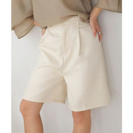 リネンライクなツイード素材が春、夏らしいハーフパンツです。センタープレスが表と裏両方に入っていて、脚が絞まってみえスタイルアップになります。後ろのウエスト部分はゴムになっているので、サイズの心配はありません。ウエストを留める部分は、鍵ホックタイプになっています。両脇のポケットは手を入れても余裕ができるくらい、ゆったりとしています。