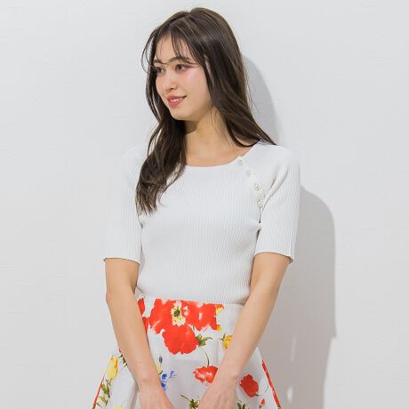 アシンメトリーに付いた、大ぶりなパールがワンポイントの、どんなボトムでも合わせやすい万能トップスです。