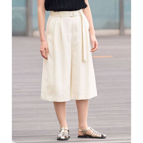 ■デザイン今季トレンドのショートパンツ。より大人っぽく穿けるよう、膝が隠れる軽快なレングスと、分量感のあるシルエットでスカートのような感覚で着用できる今年らしい鮮度のあるNEWボトムです。共のベルトを合わせて、ウエストマークしての着用もおすすめです。■素材経糸にキュプラ、緯糸にレーヨン麻の混紡糸を使用した素材です。ナチュラルな膨らみ感と滑らかなタッチ、落ち感があり、上品な光沢がありながらもリネンのナチュラルな節が感じられます。シワになりにくく、手洗い可能なので盛夏に向けておすすめの素材です。