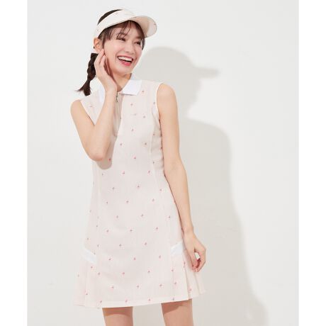スポーティな雰囲気の中にも上品で涼しげなサッカー生地を使用し、フラミンゴやフラッグのアイコンがデザインアクセントのノースリーブワンピース。